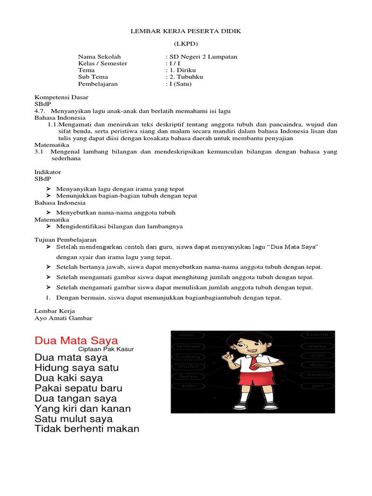 lagu dua mata saya ciptaan pak kasur, buku tematik kelas 1 tema 2 …