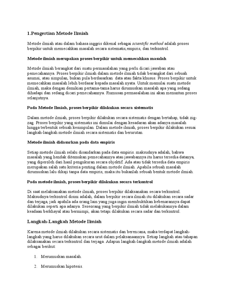 1.Pengertian Metode Ilmiah: Metode ilmiah merupakan proses berpikir untuk memecahkan masalah