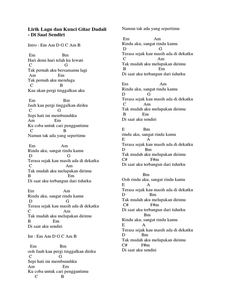 Kunci Gitar Lirik Lagu Di Saat Sendiri - Dadali - Berita Chord …