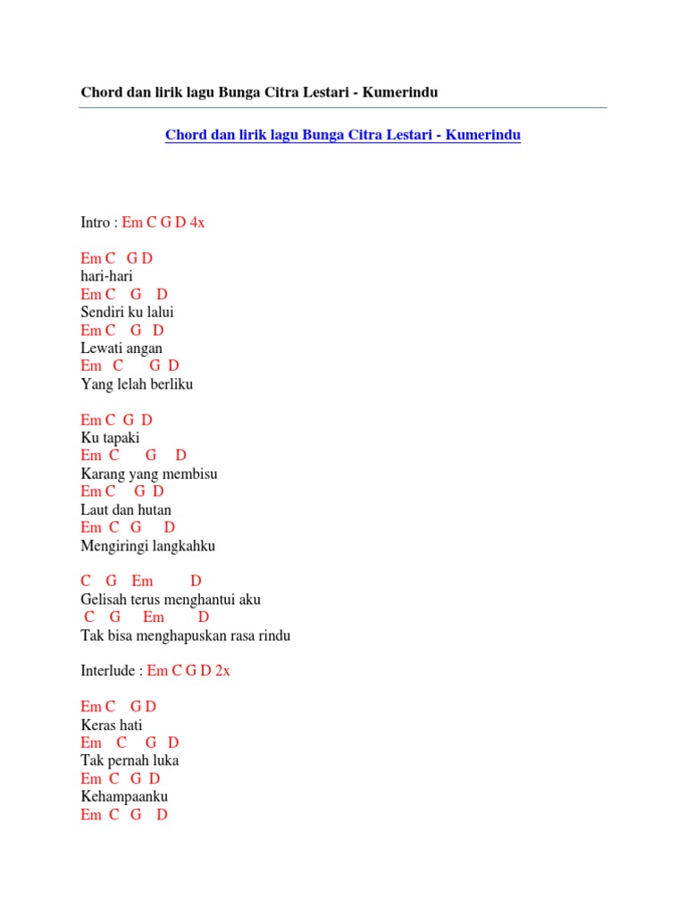 Chord Dan Lirik Lagu Bunga Citra Lestari - Kumerindu