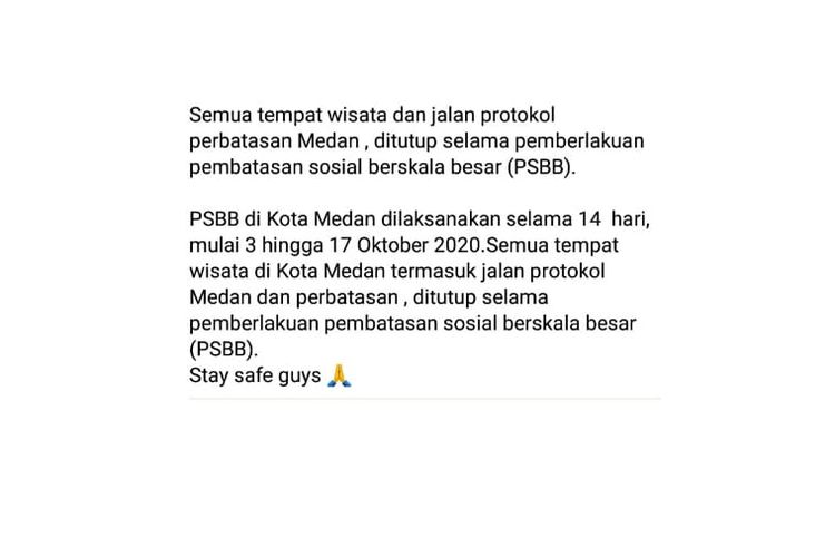 HOAKS] Kota Medan Berlakukan PSBB 3-17 Oktober 2020