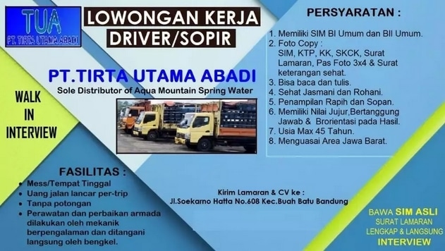 Lowongan Kerja) Dibutuhkan Driver di PT Tirta Utama Abadi Bandung …