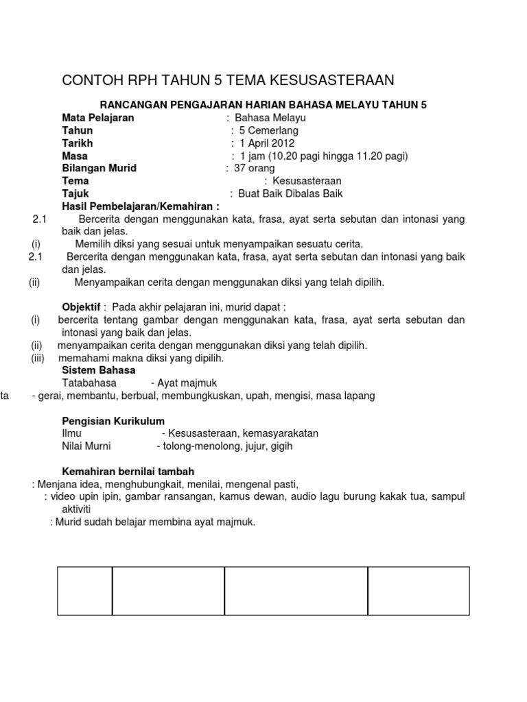 Contoh Rph Tahun 5 Tema Kesusasteraan