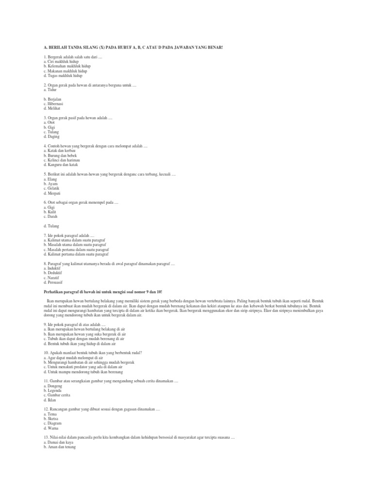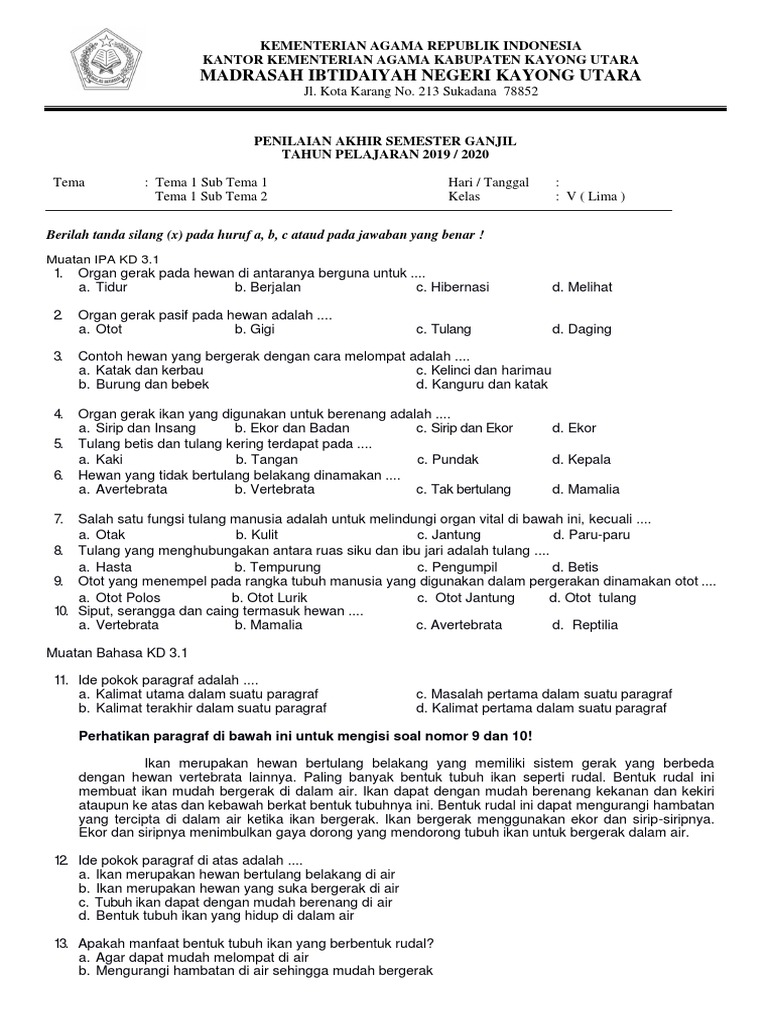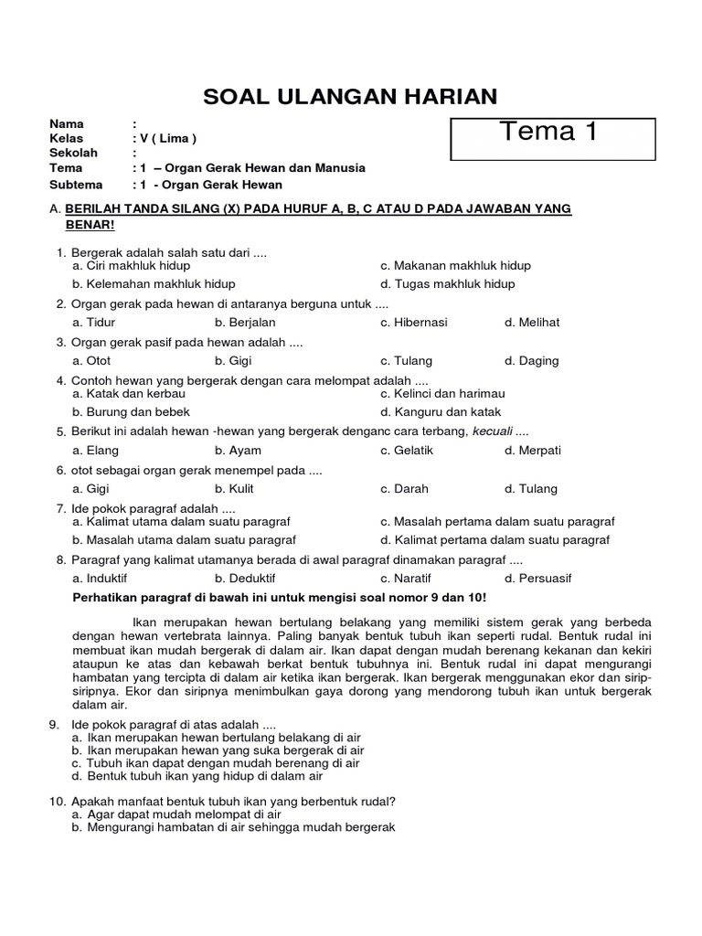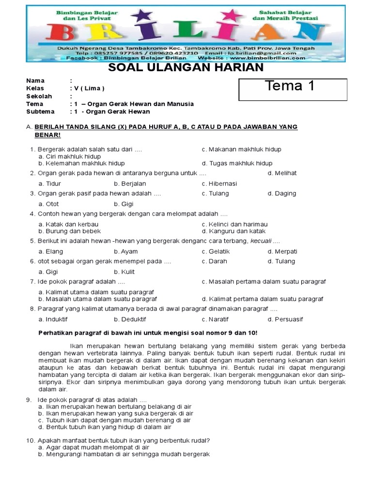 PDF) Soal Kelas 5 SD Tema 1 Subtema 1 Organ Gerak Hewan Kurikulum …