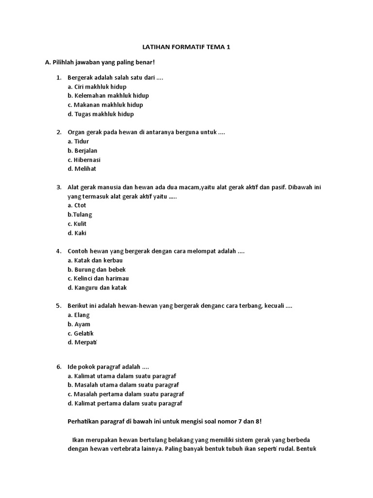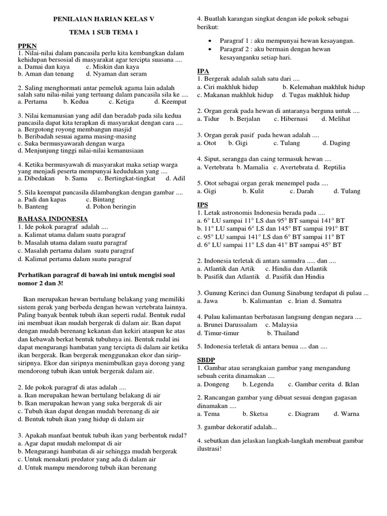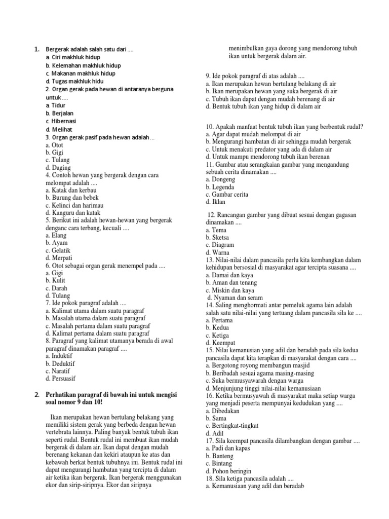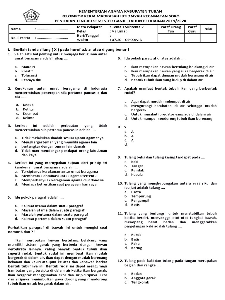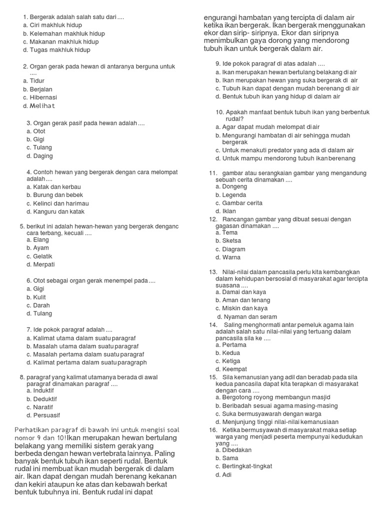 PDF) Soal Kelas 5 SD Tema 1 Subtema 1 Organ Gerak Hewan Kurikulum …