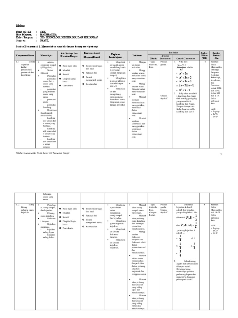 Silabus Matematika SMK Pariwisata Kelas XII