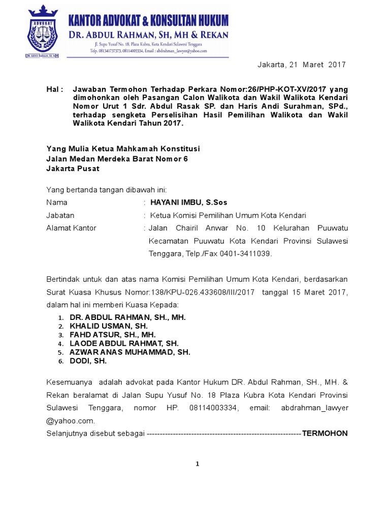 PUTUSAN NOMOR 26/PHP.KOT-XV/2017 DEMI KEADILAN BERDASARKAN KETUHANAN YANG MAHA ESA MAHKAMAH KONSTITUSI REPUBLIK INDONESIA [1.1