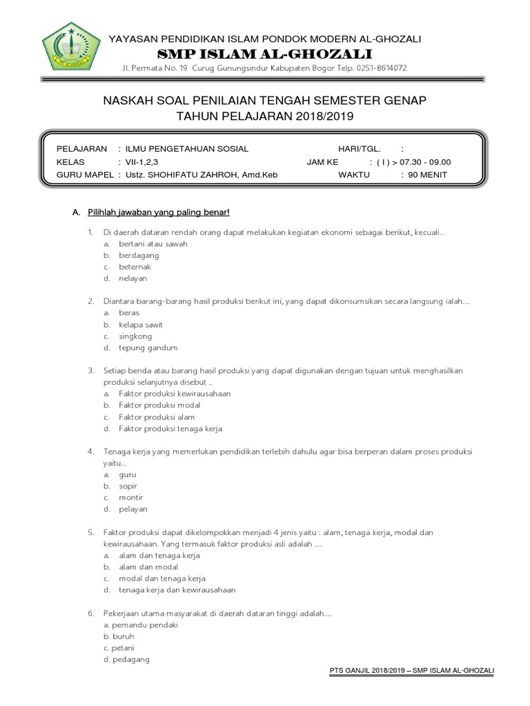Smp Islam Al-Ghozali: Naskah Soal Penilaian Tengah Semester Genap TAHUN PELAJARAN 2018/2019