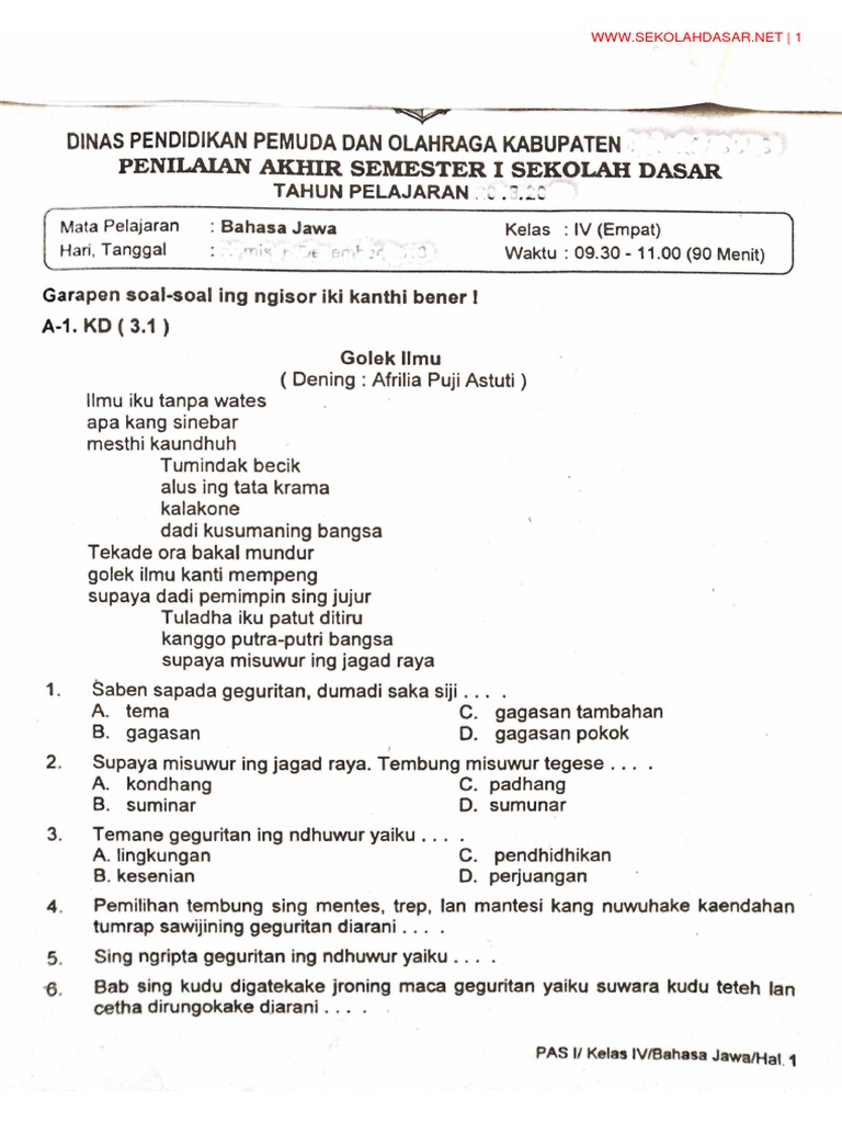 Soal Uts Bahasa Jawa Kelas 4 Semester 2 Kurikulum 2013 - Temukan Jawab