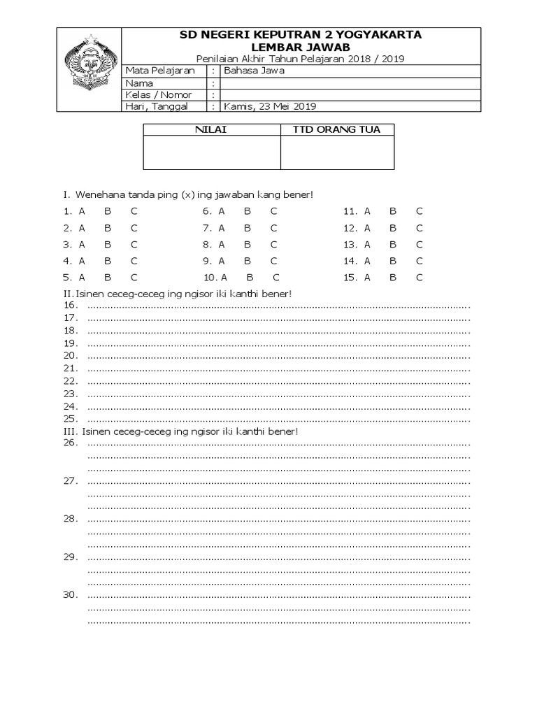Soal Ujian Sekolah Bahasa Jawa Kelas 6 Sd 2018 - Guru Galeri