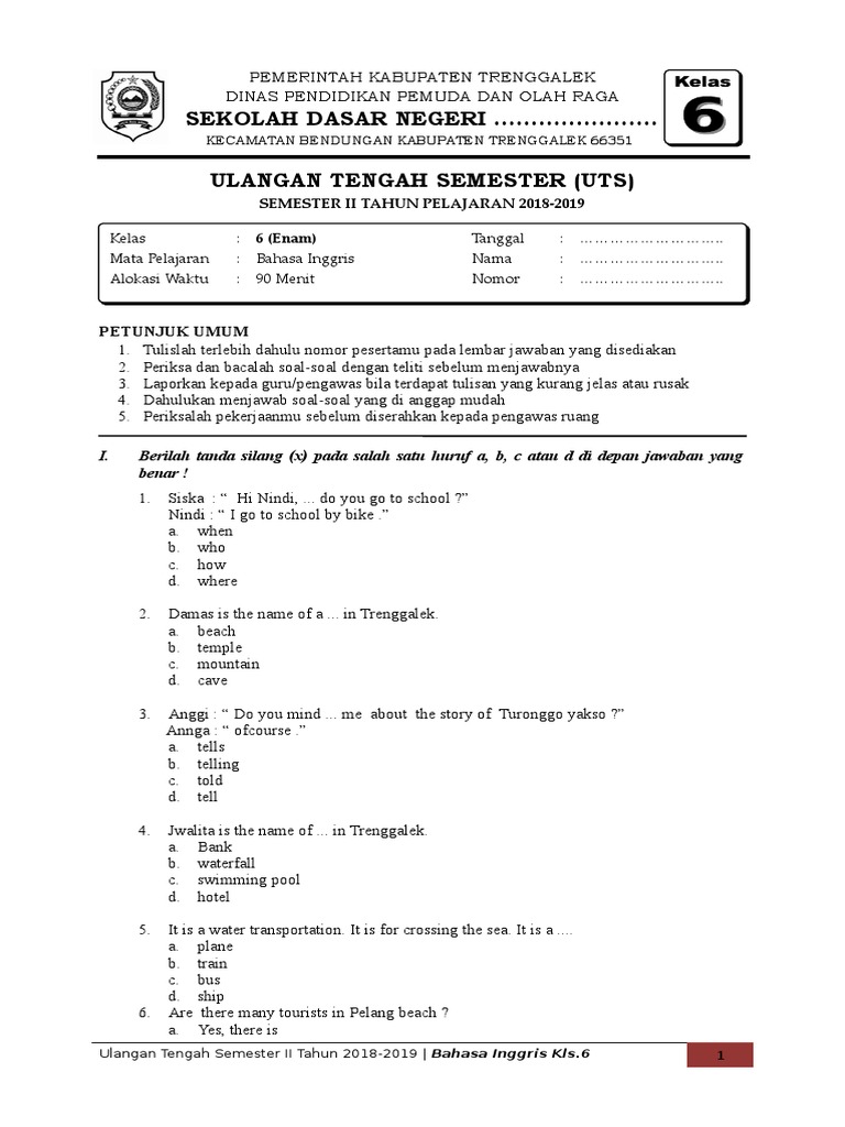PDF) Soal UAS Semester 1 Bahasa Inggris Kelas 6 1 | try dey …