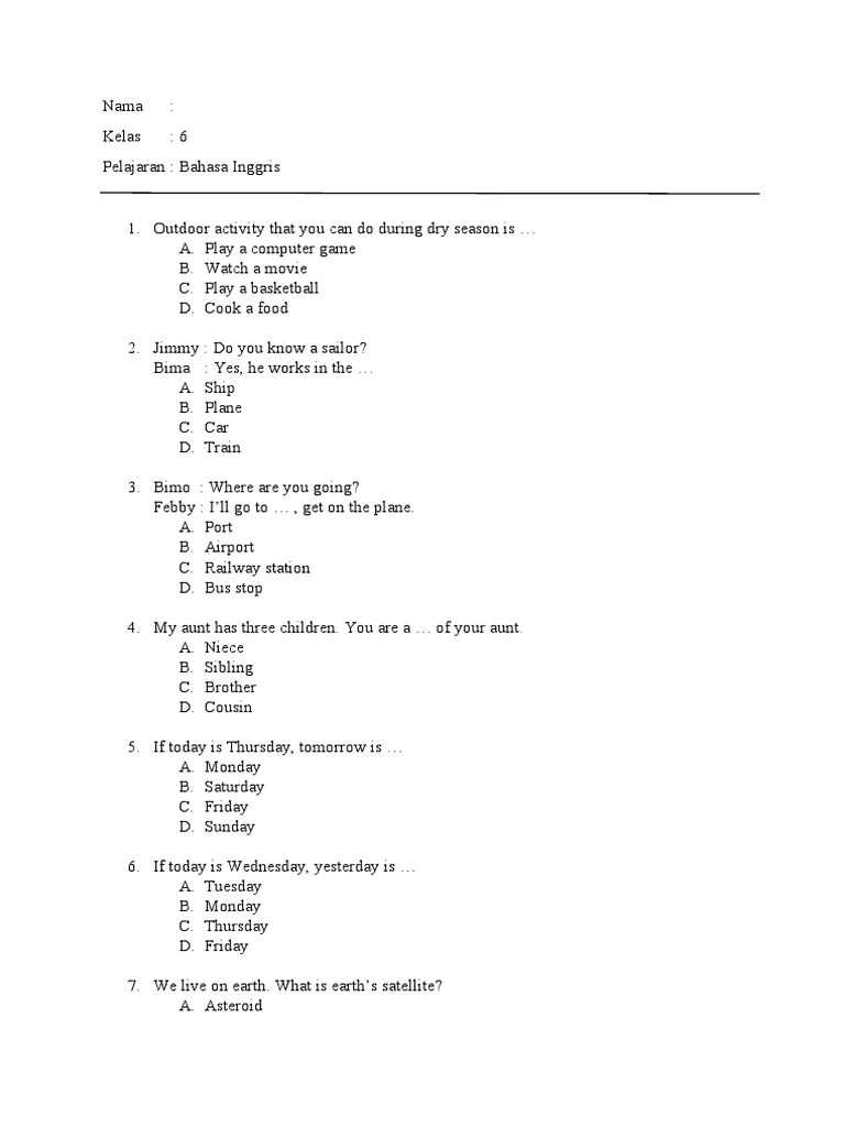 Download Contoh Soal PTS Bahasa Inggris Kelas 6 Semester 2 …