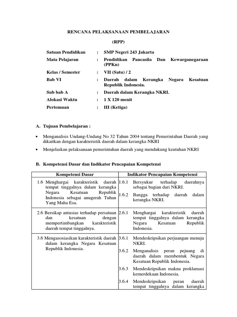 RPP PPKn Bab 6 Kelas 7 Pertemuan III