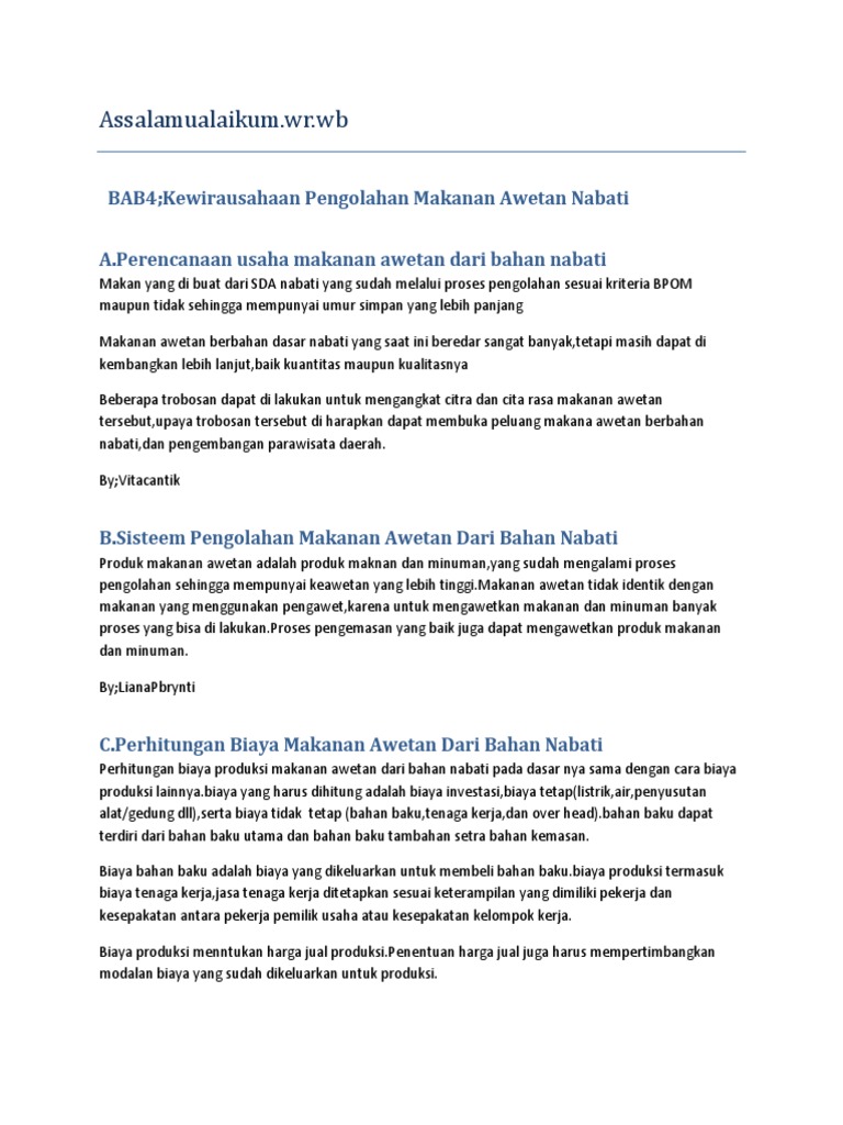 Wirausaha Produk Pengolahan Makanan Awetan dari Bahan Nabati ⋆ DOC | PDF ⋆ Download Contoh Makalah Lengkap