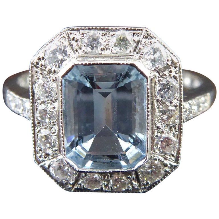 1.20 Carat Emerald Cut Aquamarine and Diamond Cluster Ring in the Art Deco Style at 1stDibs