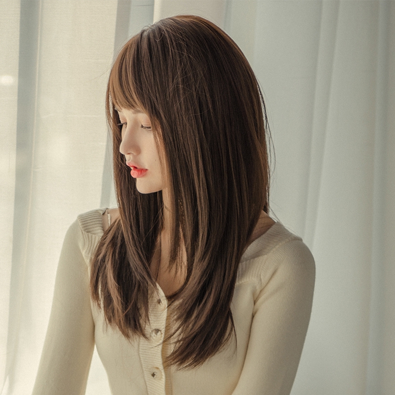 Wig perempuan tengah rambut panjang alami kepala penuh wajah bulat poni merah net gaya rambut Korea | Shopee Indonesia