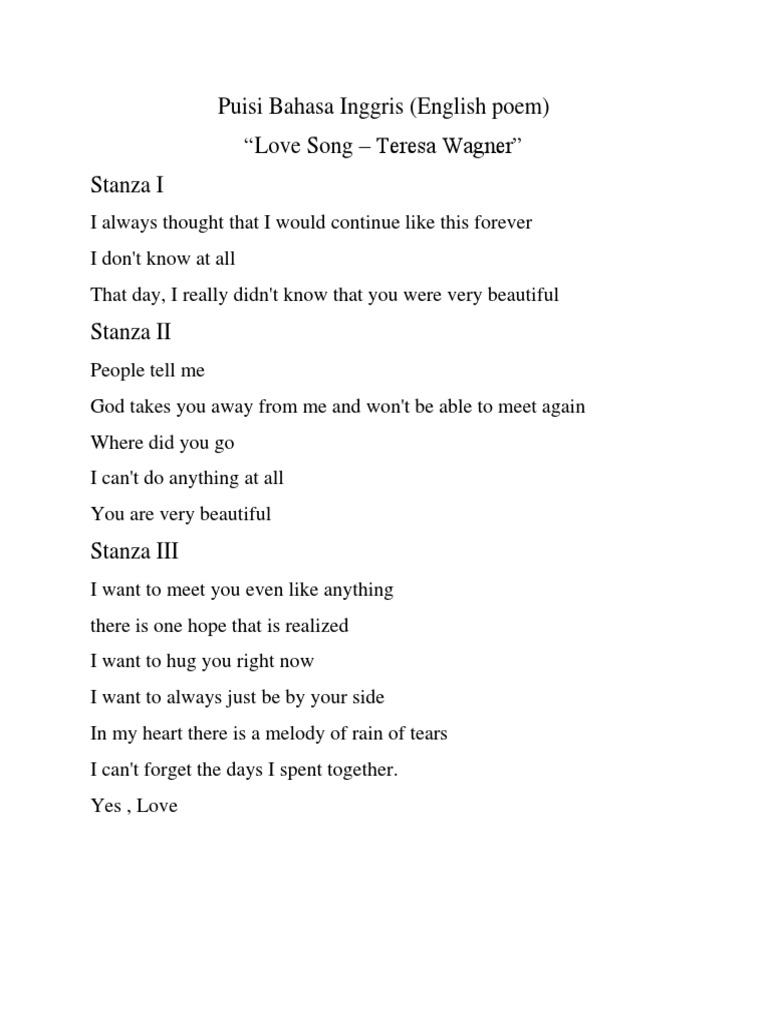 Puisi Bahasa Inggris (English poem) “Love Song – Teresa Wagner” Stanza I