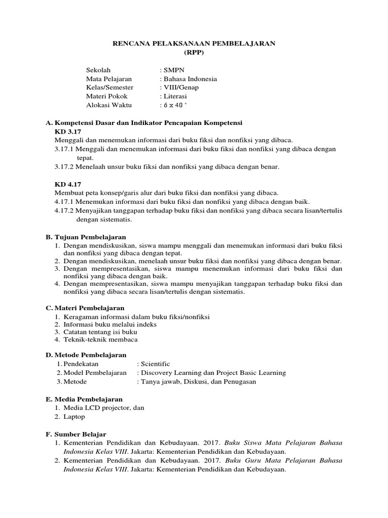 Rpp Bahasa Indonesia Kelas 8 K13 Revisi Tahun 2020 | sch. paperplane