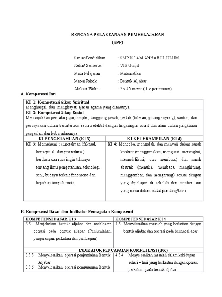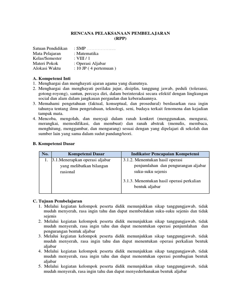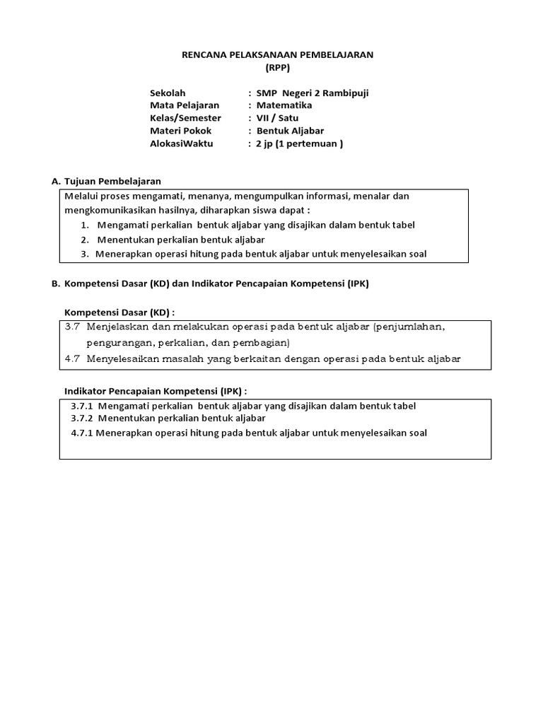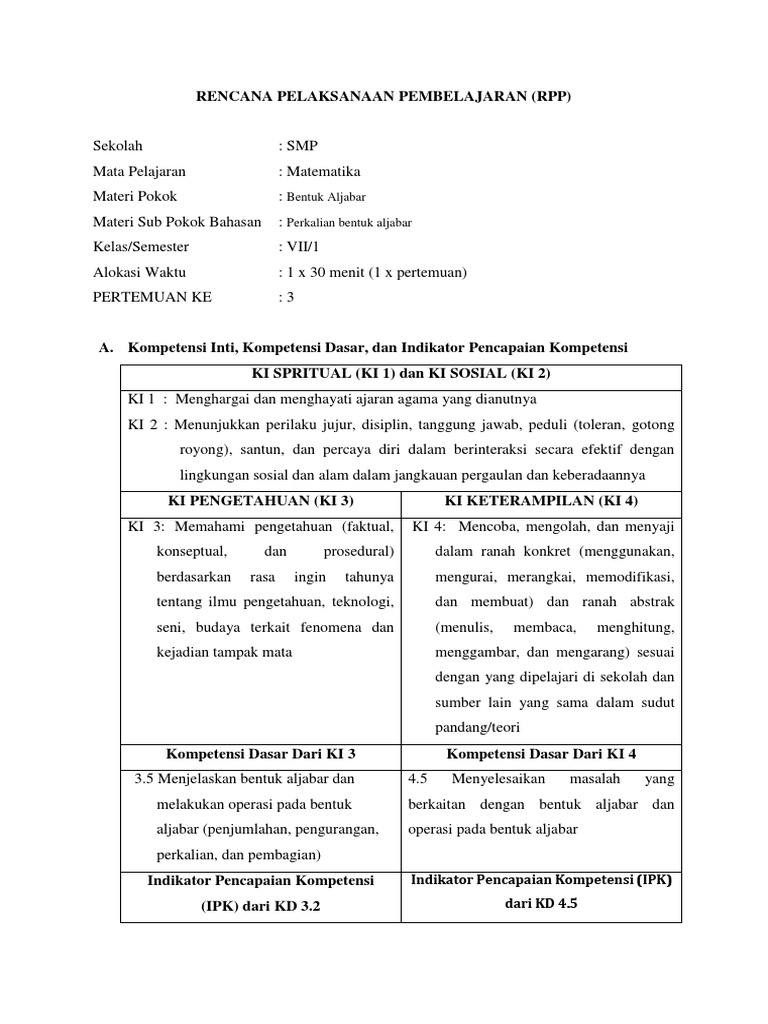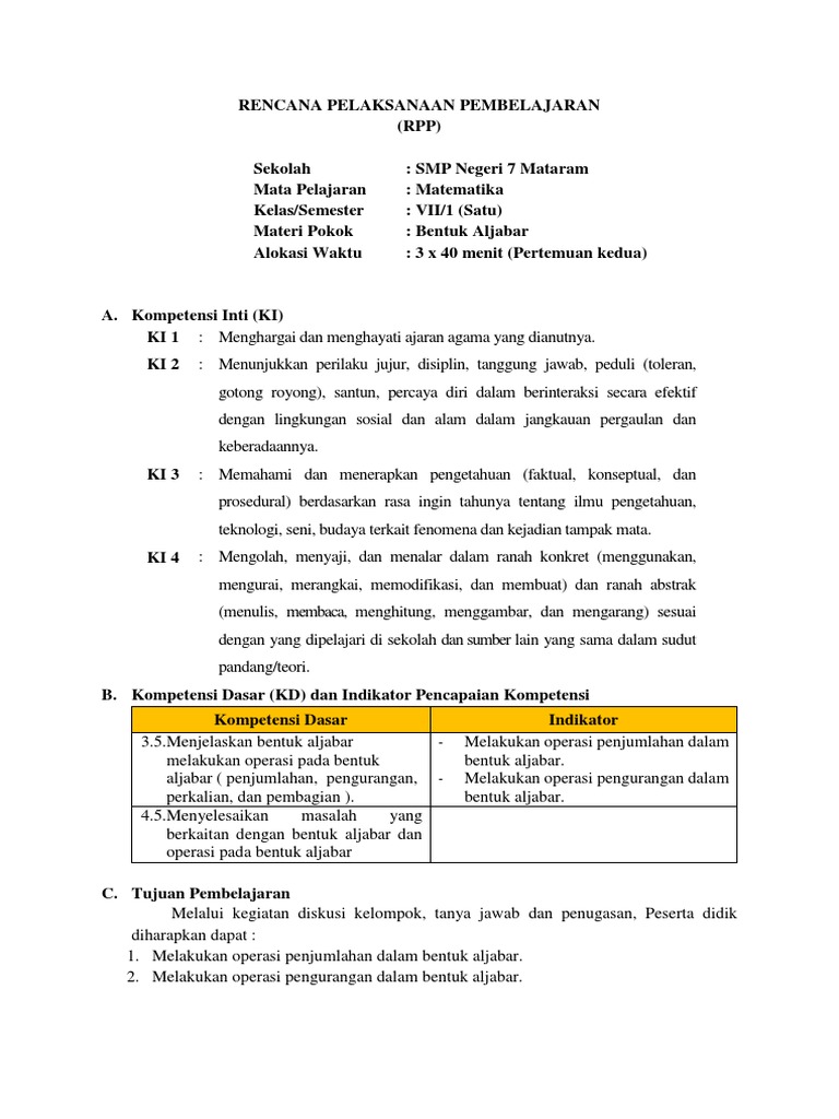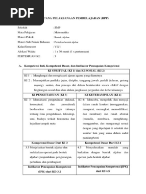 Rpp Bentuk Aljabar Kelas 7 Kurikulum 2013 - Berbagi Bentuk Penting