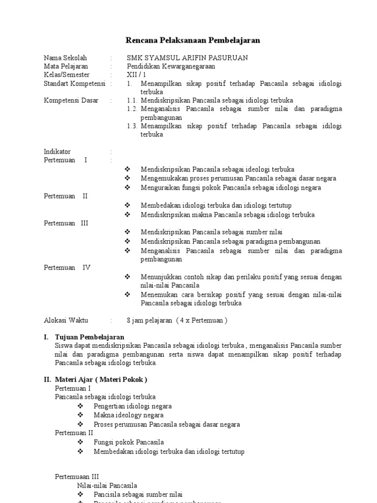 RPP 1 Lembar PKN SMK Kelas XII Semester 1 Lengkap Edisi Revisi …