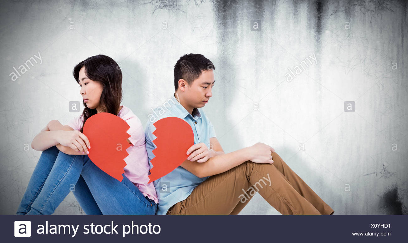 Composite image of sad couple holding broken heart pieces Stock Photo - Alamy