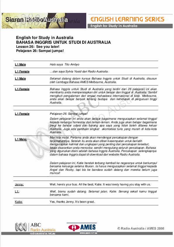 PDF) English for Study in Australia BAHASA INGGRIS UNTUK STUDI DI AUSTRALIA Lesson 26: See you later! Pelajaran 26: Sampai jumpa | Lukius Balyo - Academia.edu