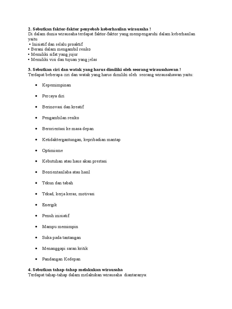 2. Sebutkan faktor-faktor penyebab keberhasilan wirausaha !