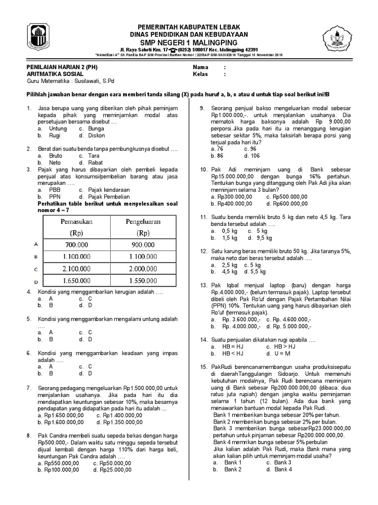 Soal dan Jawaban Uji Kompetensi 6 Aritmatika Sosial Kelas 7 …