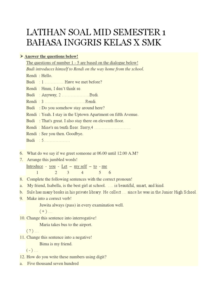 Latihan Soal Mid Semester 1 Bahasa Inggris Kelas x Smk