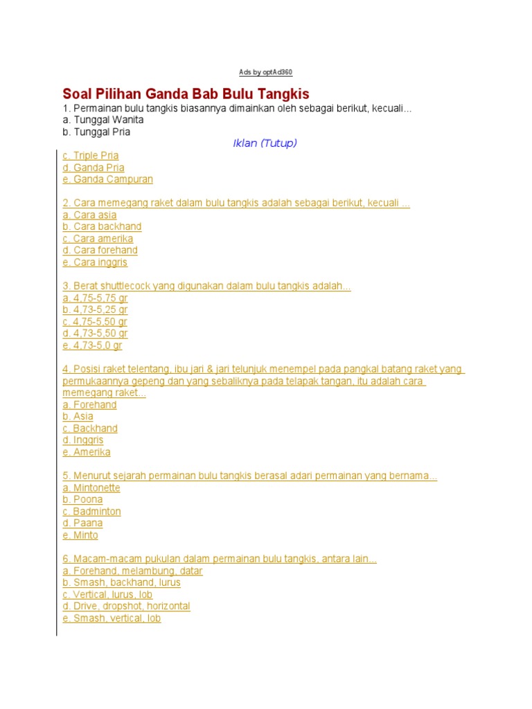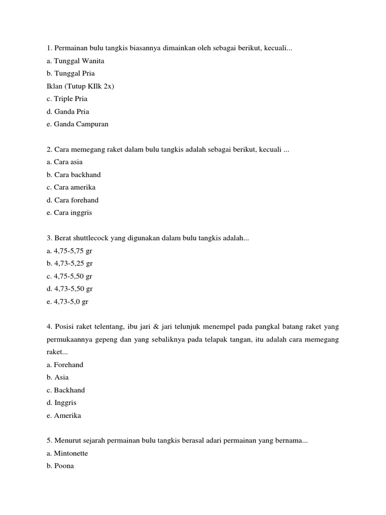 Contoh soal tentang bulu tangkis pilihan ganda lengkap jawaban – Fiqihislam