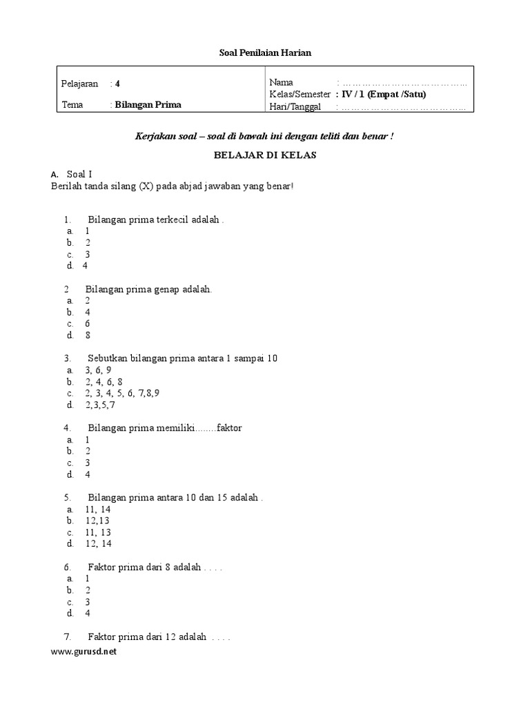 Soal ulangan harian matematika kelas 4 sd: bilangan prima - antapedia.com