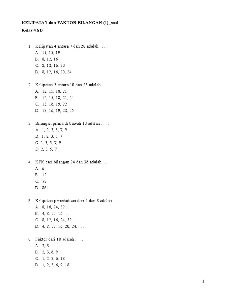 Soal Matematika Kelas 4 : Kelipatan dan Faktor - Contoh RPP SD dan Soal SD