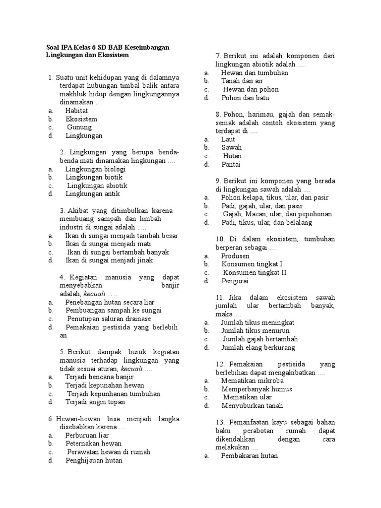Soal IPA Kelas 6 SD BAB Keseimbangan Lingkungan Dan Ekosistem