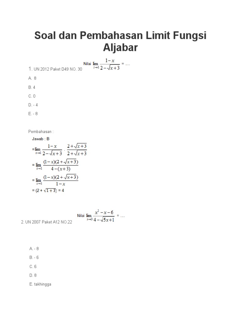Contoh Soal Limit Fungsi Aljabar dan Pembahasannya - StuDocu
