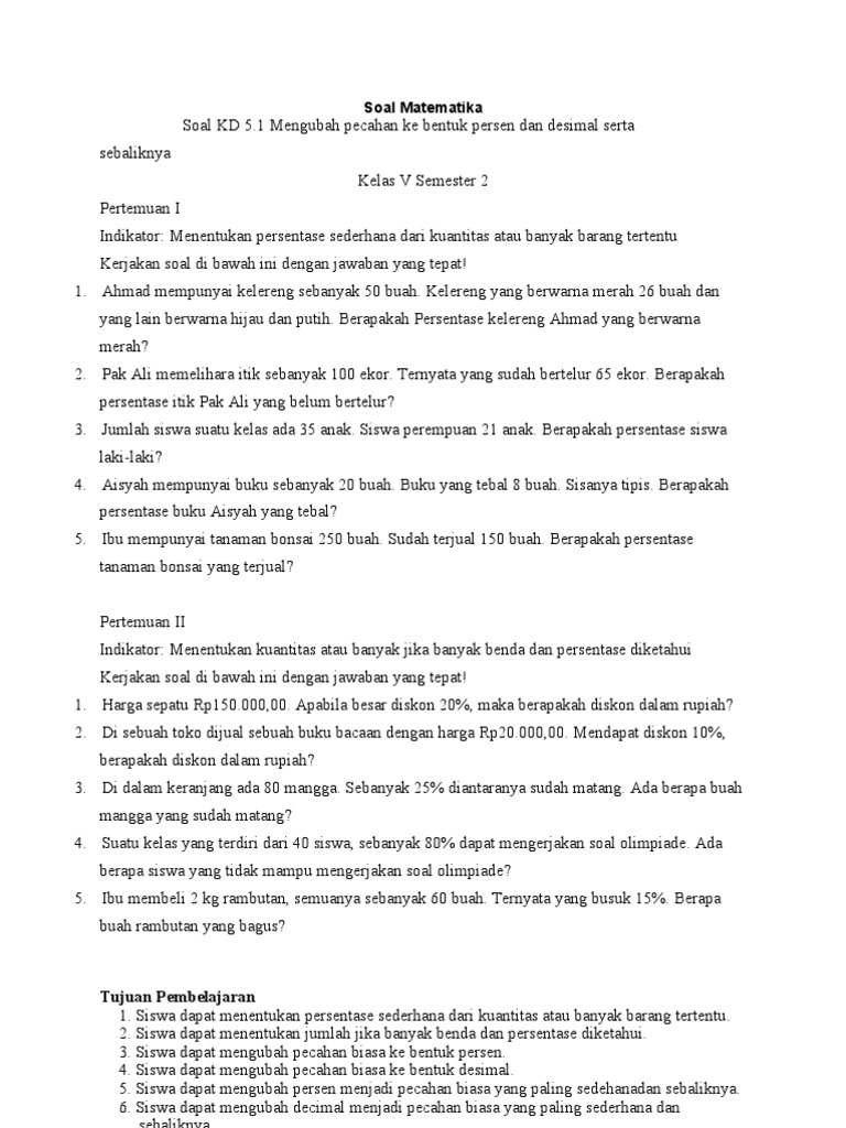 Contoh Soal Pecahan Desimal Dan Persen Kelas 5 Sd | Kumpulan Soal …