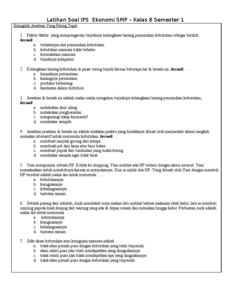 Latihan Soal IPS Ekonomi SMP – Kelas 8 Semester 1 viewIlmu yang mempelajari tentang cara manusia memenuhi berbagai macam kebutuhan hidupnya yang relatif tidak terbatas dengan sumber - [DOC Document]