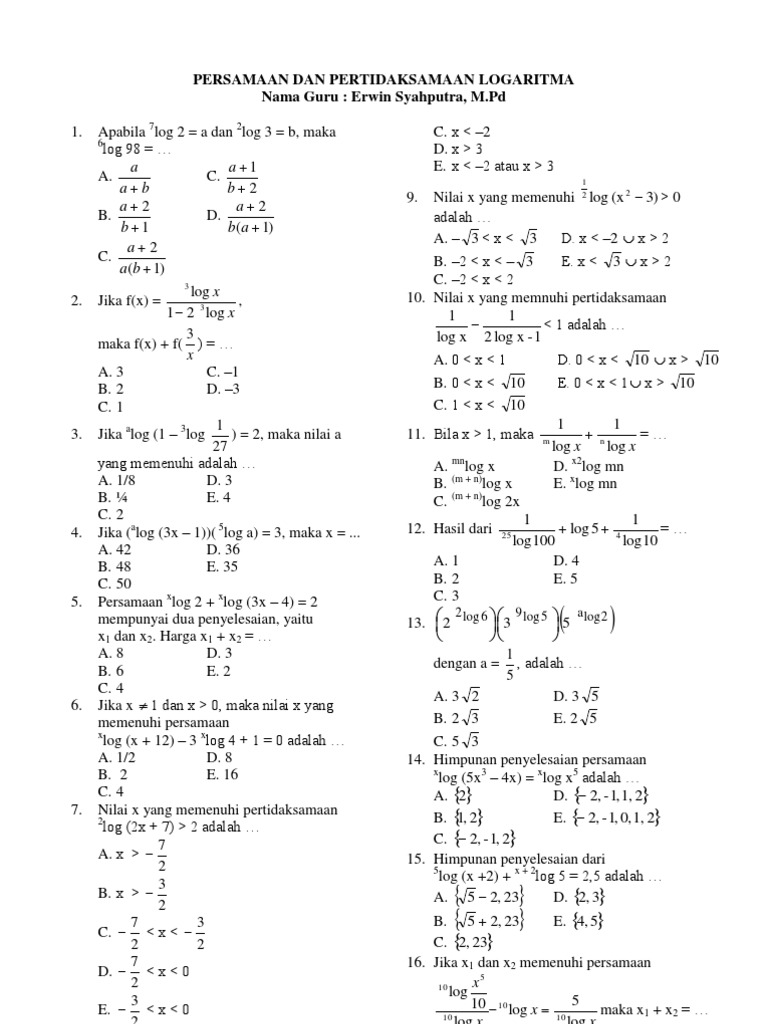 Soal Persamaan Dan Pertidaksamaan Logaritma