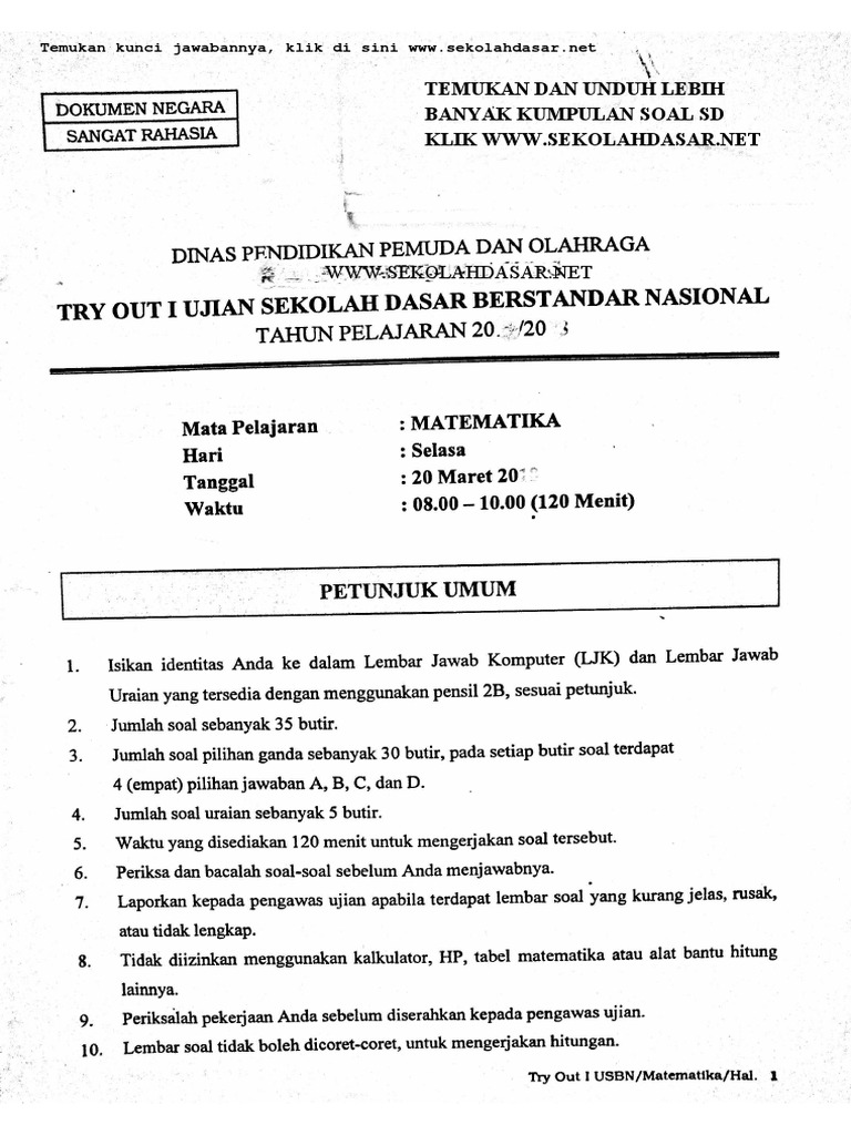 Soal Try Out I USBN SD/MI 2019 dan Kunci Jawabannya - SekolahDasar.Net