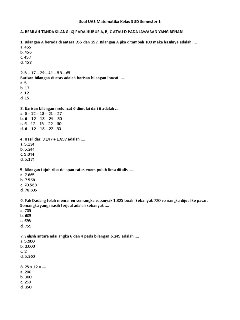 Soal Uas Matematika Kelas 3 Sd Semester 1