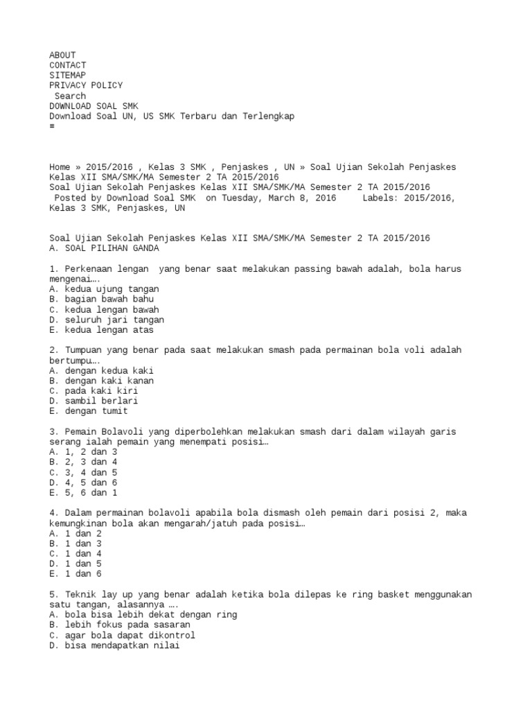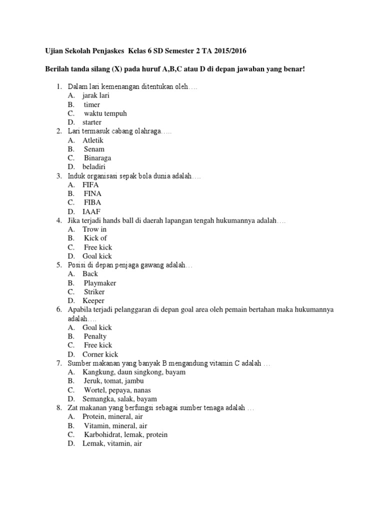 Soal Ujian Sekolah Penjaskes Sd Kelas 6 2016