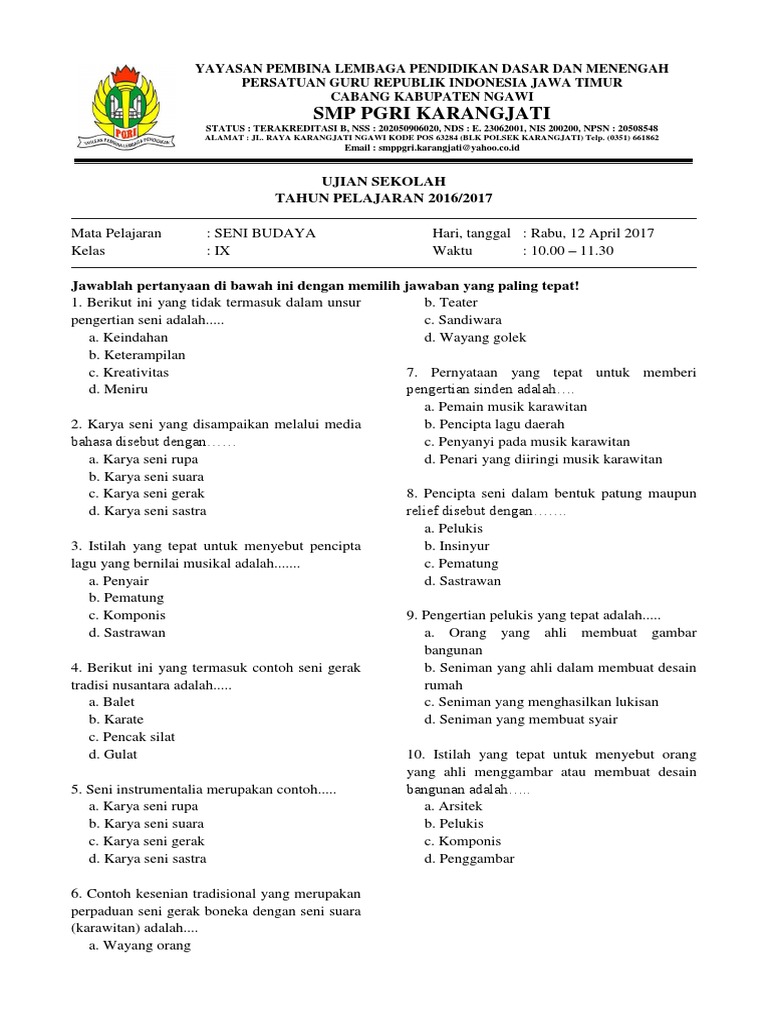 Soal Ujian Sekolah Seni Budaya Smp Dan Kunci Jawaban 2017 - Rismax