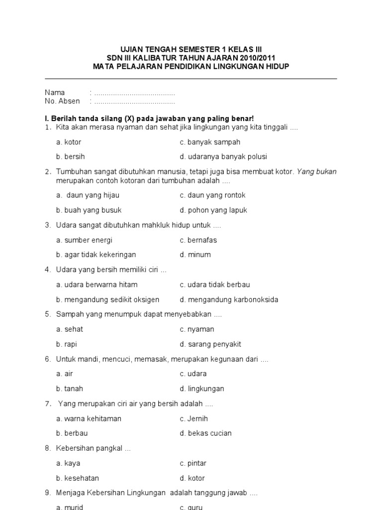 Ujian Tengah Semester 1 Kelas III Pendidikan Lingkungan Hidup …