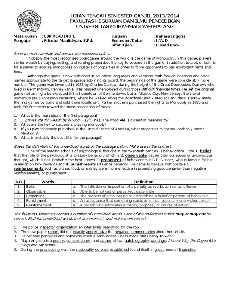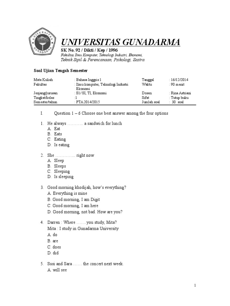 Contoh Soal Uts Bahasa Inggris Semester 1 Bsi - Dapatkan Contoh