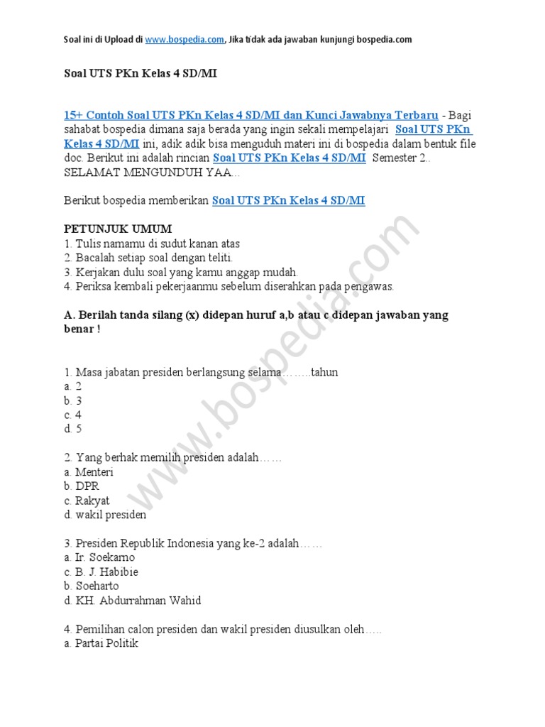 15+ Contoh Soal Uts Pkn Kelas 4 Sd/Mi Dan Kunci Jawabnya Terbaru …