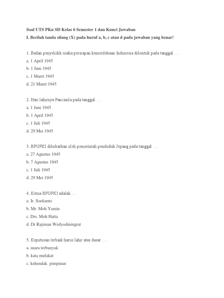 Soal Uts Pkn Kelas 6 Semester 1 Beserta Kunci Jawaban - Guru Galeri