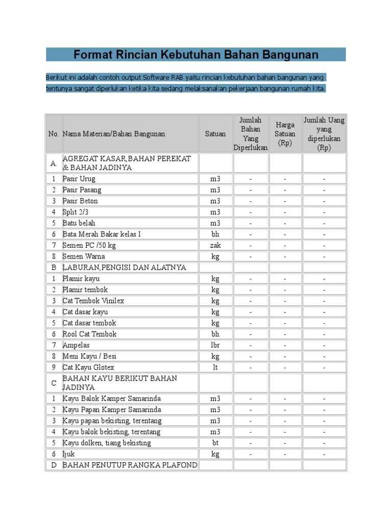 Format Rincian Kebutuhan Bahan Bangunan