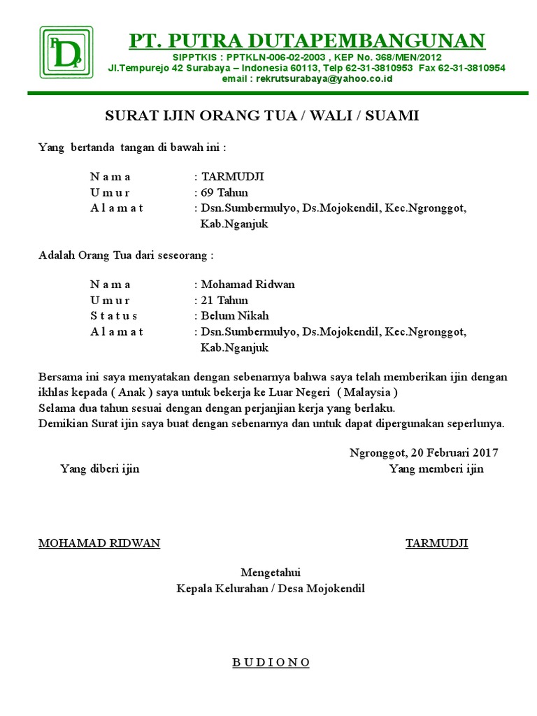 Contoh Surat Ijin Orang Tua/Suami/Istri