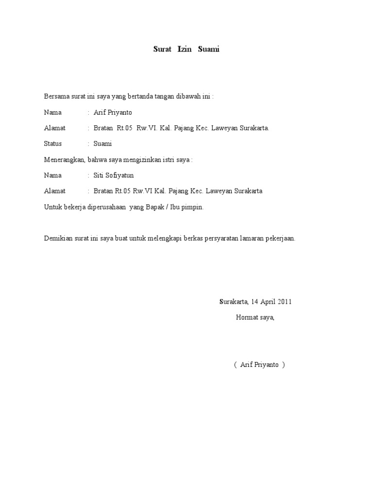 Contoh Surat Izin Kerja Dari Suami Untuk Istri Berbagi Contoh …