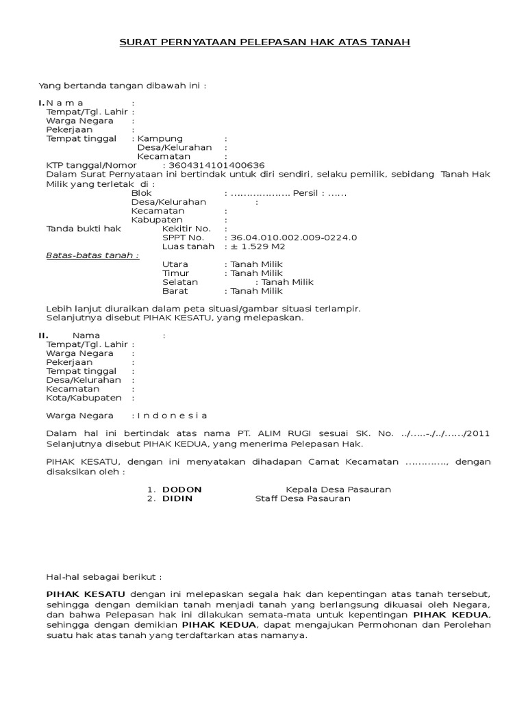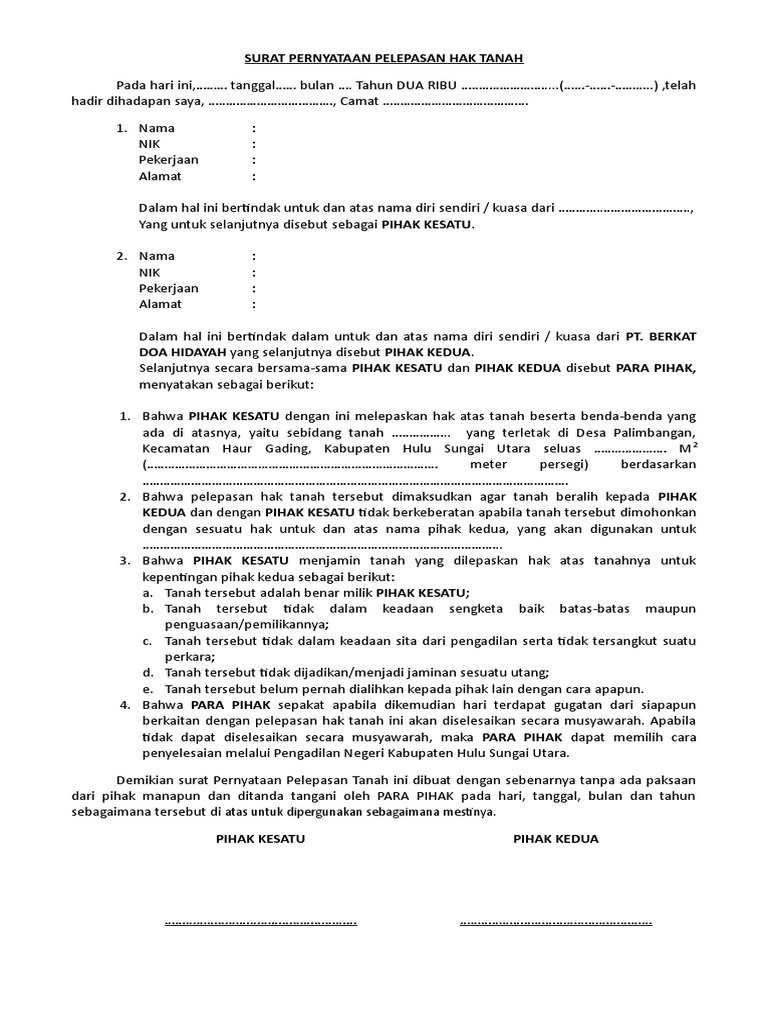 Surat Pernyataan Pelepasan Hak Atas Tanah – Terbaru