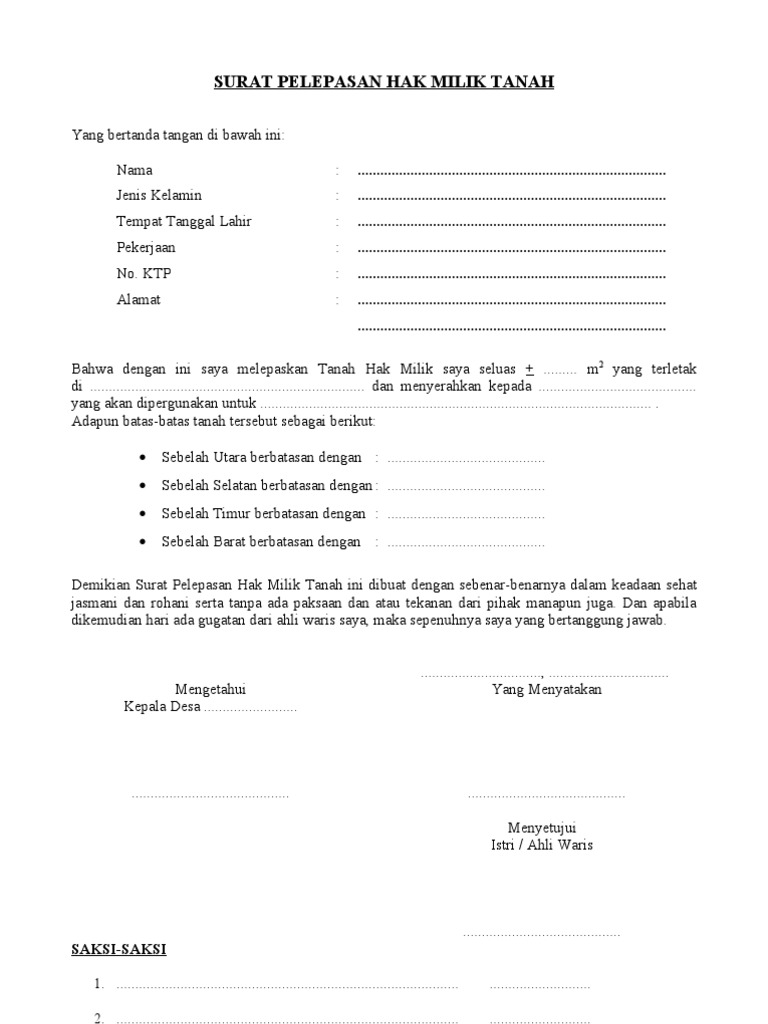 Surat Pernyataan Pelepasan Hak Atas Tanah - Kumpulan Surat Penting
